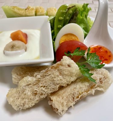 ベトナム揚げ春巻き、野菜サラダ、ゆで玉子とトマト、ヨーグルトにバナナとパパイヤ、メロン。