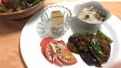 麻婆茄子、スライストマト、胡麻豆腐、シメジのおろし和え。