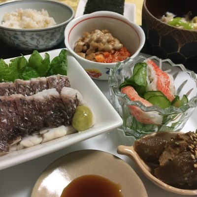 真鯛の湯霜、カニカマと胡瓜の酢の物、豚とごぼうの煮物、キムチ納豆。