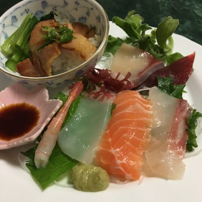 焼き豚ごはんと小松菜のお浸し、お刺身、アイスプラント。