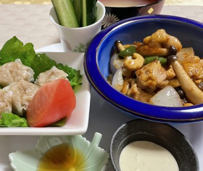 鶏のカシューナッツ炒め、焼売、胡瓜のバーニャカウダ。