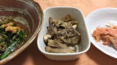 ニラ玉、舞茸煮、ほぐし鮭。