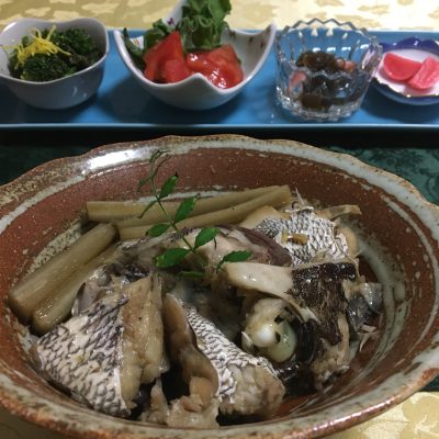 鯛のあら炊き、ブロッコリーの胡麻和え、アイスプラントとトマト、もずくと茗荷の酢の物、紅大根のピクルス。