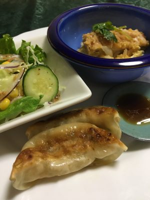 かつ丼、餃子、野菜サラダ。