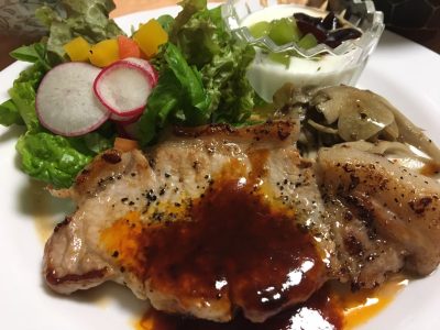 ポークチャップソテー、舞茸のニンニク炒め、野菜サラダ、ヨーグルトにキウイフルーツと黒ニンニク。