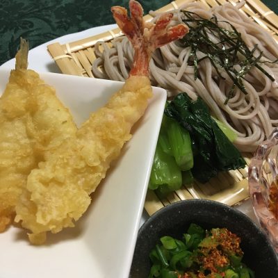 天麩羅、ざる蕎麦、小松菜のお浸し。