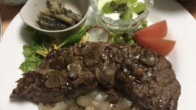 ビーフステーキとソテーオニオン、野菜サラダとトマト、ごぼうの胡麻よごし、ヨーグルトとキウイフルーツ。