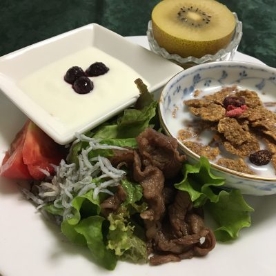 焼肉サラダ、トマトとシラス、シリアル、ヨーグルトと冷凍ブルーベリー、キウイフルーツ。