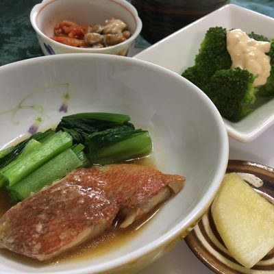 赤魚の煮付けと小松菜のお浸し、ブロッコリー、自家製沢庵、キムチ納豆。