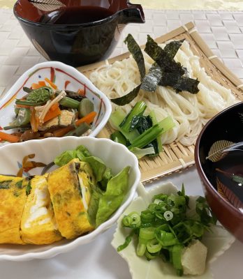 玉子焼きとレタス、山菜と揚げの炒め煮、生素麺。