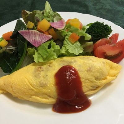 オムライス、野菜サラダに紅芯大根と人参煮、ブロッコリーとトマト。