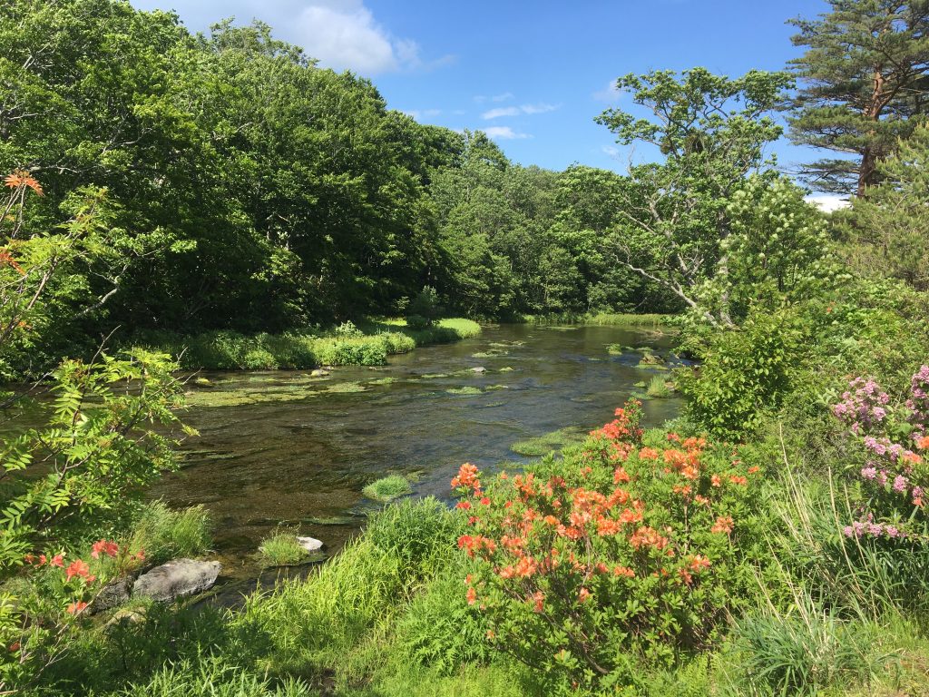 青森県八甲田連峰 グダリ沼の清流。盛夏が訪れると一面が白い梅花藻に覆われる。