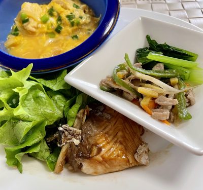 親子煮、サゴシのバルサミコソースとレタス、豚とピーマン炒めと小松菜のお浸し。