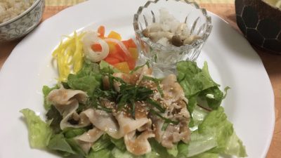 豚しゃぶの梅肉和え、レタス、人参のピクルス、シメジのおろし和え。