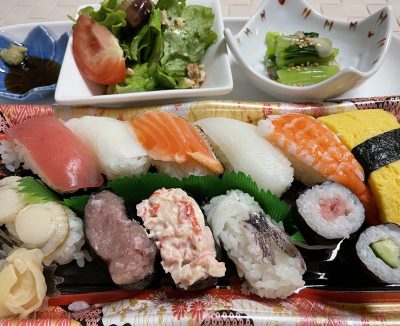 握り寿司のお弁当、野菜サラダ、小松菜のお浸し。