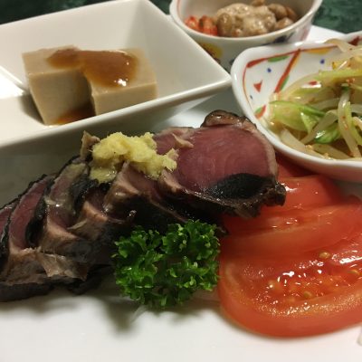 鰹のタタキ、スライストマト、ネギともやしの酢の物、胡麻豆腐、キムチ納豆。