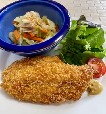鰺フライ、レタスとプチトマト、キャベツとベーコンのコンソメ煮。