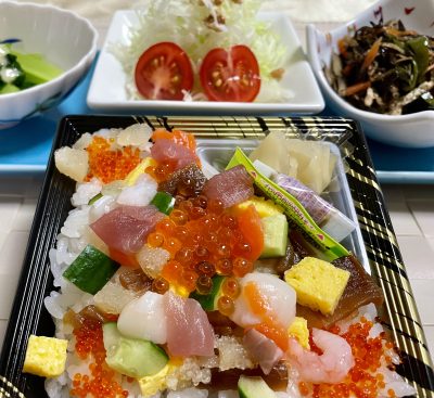 テイクアウトの海鮮ちらし寿司、千切りキャベツとプチトマト、ひじきの煮物、小松菜のお浸し。