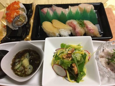 テイクアウトの握り寿司(漬け真鯛、ヒラマサ、帆立他)、タタキ長芋の梅肉和え、野菜サラダ、もずくと胡瓜の酢の物。