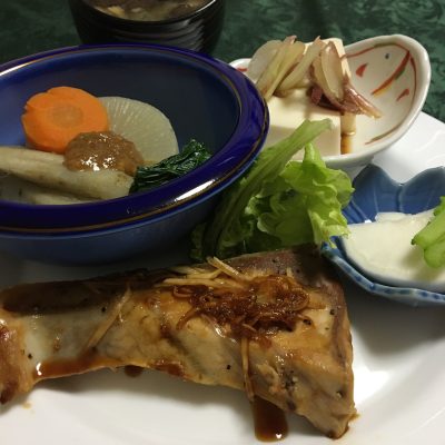 鰤の照焼とレタス、根菜の煮物、冷や奴と茗荷、カブの浅漬け。