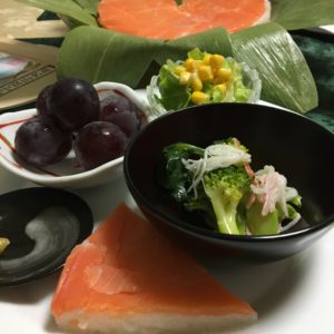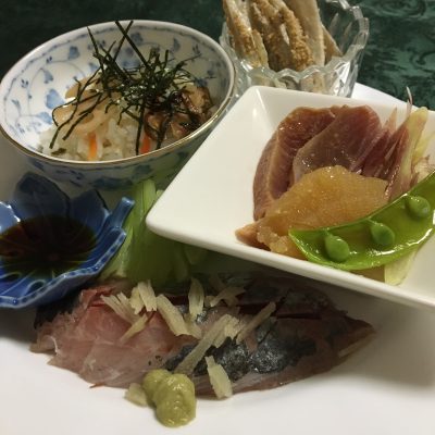 ちらし寿司、鰺のお刺身、マグロの漬け刺しと数の子、茗荷の酢漬とエンドウ、ごぼうの胡麻よごし。