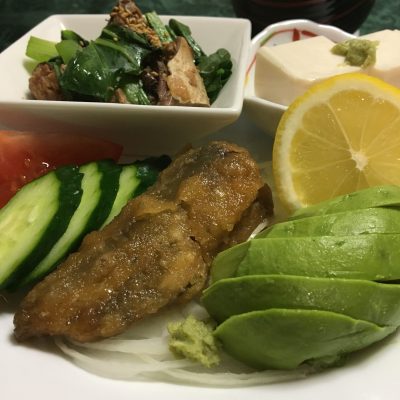 鰺の南蛮漬とオニオンスライス、アボカドスライス、胡瓜とトマト、小松菜の鯖味噌和え、冷や奴。