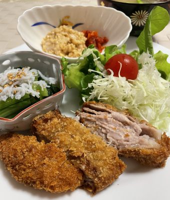 ミルフィーユ豚かつ、千切りキャベツとレタスにプチトマト、小松菜のシラス和え、キムチ納豆。