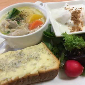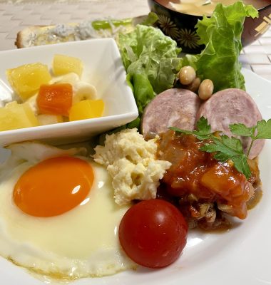 目玉焼き、シラスチーズトースト、ソーセージとポテトサラダ、ラタトゥイユとプチトマト、レタスと豆のサラダ、フルーツポンチ。