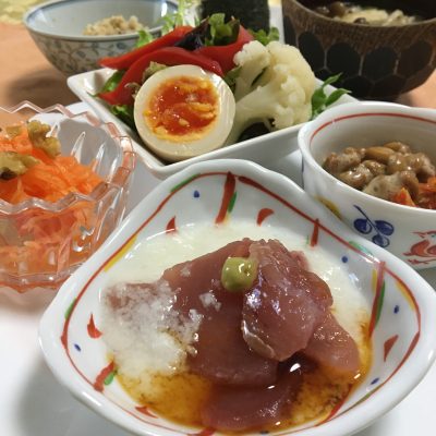 まぐろの山かけ、野菜サラダに煮玉子とピクルス、キャロットラペ、キムチ納豆。