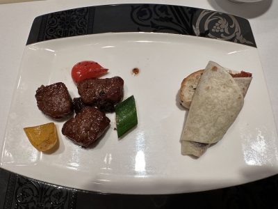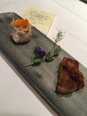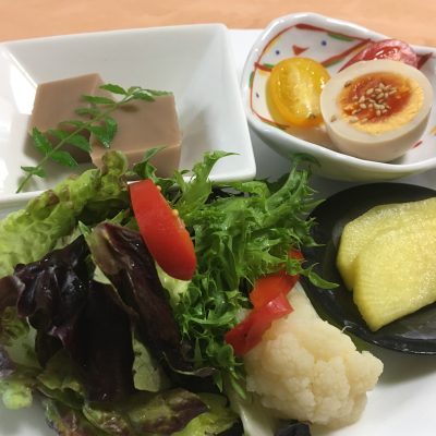 ピクルスサラダ、胡麻豆腐、煮玉子とプチトマト、自家製沢庵。