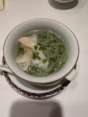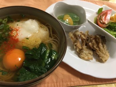 とろろ月見煮麺、舞茸天麩羅、野菜サラダ、お刺身こんにゃく。