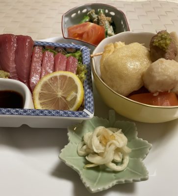 鮭カマ焼、煮物の冷製、茄子と胡瓜の出汁浸し、ブロッコリーの味噌がけ、自家製のぬか漬け、納豆と玉葱。プラチナ世代は野菜をたくさん摂るように心がけたい。