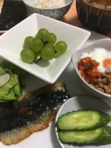 365日クッキング 11月5日の朝ごはん 2021年11月5日 鮭カマ焼とレタス、長芋、キムチ納豆、ピオーネとキウイフルーツ。 【365日cooking】調理時間30分以内がサブコンセプトコロナ禍で家族そろって在宅work。テイクアウトもクッキングのうちと唱えながら得意でもない料理を手を抜きながらひたすら作る。 2020年11月5日の朝ごはん 鰯の蒲焼き、自家製のぬか漬け胡瓜、キムチ納豆、ぶどう。