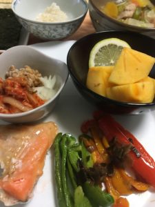 365日クッキング 11月15日の朝ごはん 2021年11月15日 ボアローのコンソメ煮、コーンポタージュ、塩たまごとロマネスコにトマト、トースト。 【365日cooking】調理時間30分以内がサブコンセプトコロナ禍で家族そろって在宅work。テイクアウトもクッキングのうちと唱えながら得意でもない料理を手を抜きながらひたすら作る。 2020年11月15日の朝ごはん 塩鮭のカマ焼きとパプリカのソテー、豚汁、玉葱キムチ納豆、柿とレモン。