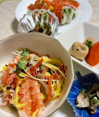365日クッキング 4月11日の晩ごはん(ふくだちのペペロンチーノ、前橋Sweets Shop YOSHIDA 雪ほたかのショートブレッド) ちらし寿司、サーモンカルパッチョ、煮物、山菜の出汁和え、きのこの醤油煮。 お食後はショートブレッドを2本だけ。 【365日cooking】調...