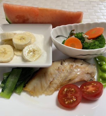 365日クッキング 5月6日の朝ごはん(鯵の開きの湯煮とビタミン大根のおろし) その1 銀鮭の西京味噌焼にプチトマトとエンドウ、小松菜のお浸し、ブロッコリーの胡麻だれに人参の甘煮、ヨーグルトとバナナ、すいか。 選択制の朝...