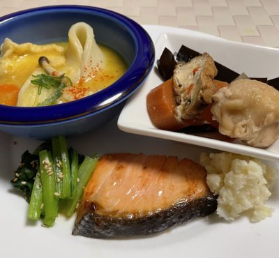 365日クッキング 2月11日の晩ごはん(銀鮭の西京味噌焼と煮物) 銀鮭の西京味噌焼とポテトサラダ、小松菜の胡麻和え、鶏肉と厚揚げの煮物、ほうとう。 【365日cooking】調理時間30分以内がサブコンセプ...