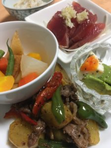 365日クッキング 11月22日の晩ごはん 2021年11月23日 鰯の蒲焼き紫キャベツ、紅大根の甘酢漬、春菊の胡麻和え、南瓜の甘煮、キムチ納豆。 【365日cooking】調理時間30分以内がサブコンセプトコロナ禍で家族そろって在宅work。テイクアウトもクッキングのうちと唱えながら得意でもない料理を手を抜きながらひたすら作る。 2020年11月22日の晩ごはん 牛肉と柿のカキソース炒め、鰹の刺身、煮物、玉子とアボカドのサラダ。