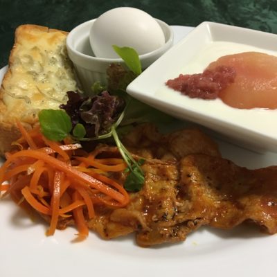 365日クッキング 10月29日の朝ごはん(シラスチーズトーストとポークチャップ) ポークチャップと人参のソテー、レタス、シラスのチーズトースト、ゆで玉子、ヨーグルトとりんごのコンポート。 【365日cooking】調理時間...