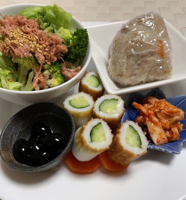 365日クッキング 5月6日の晩ごはん(こんにゃくの田楽、ローストビーフ) 炊き込みおにぎり、ちくわ胡瓜、コンビーフサラダ、黒豆煮、キムチ。 【365日cooking】調理時間は30分以内がサブコンセプトコロナ禍以来...