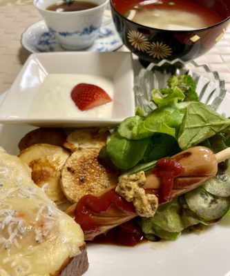 365日クッキング 5月8日の朝ごはん(焼ながいもとソーセージ、スクランブルエッグとエディブルフラワー) シラスチーズトースト、フランクフルトソーセージ、野菜サラダ、焼エリンギと焼長芋、ブロッコリーの胡麻だれ、ヨーグルトといちご。 【365日co...