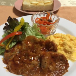 ポークチャップにパプリカとレタスのサラダ、スクランブルエッグ、キャロットラペ。