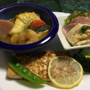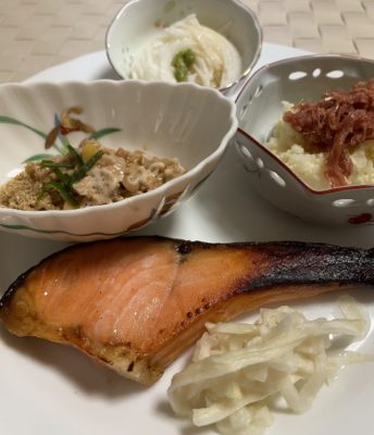 365日クッキング 2月6日の晩ごはん(羽根付き焼き餃子) 銀鮭の西京味噌焼、切り干しの柚子大根、ポテトサラダとコンビーフ、千切り長芋、胡麻納豆。 【365日cooking】調理時間30分以内がサブコ...
