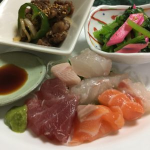 365日クッキング 9月7日の晩ごはん(ウェルダン過ぎたサーロインステーキ) 魚屋さんのお寿司(中トロ・カンパチ・真鯛他)、胡瓜の味噌マヨ添え、冷や奴、ほうれん草の胡麻和え。手を抜きたくてお寿司が続くのである。【365...