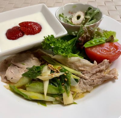 365日クッキング 5月24日の朝ごはん(ラムチョップソテー、玉葱納豆) 豚モモの生姜焼き、レタスとトマト、春菊とちくわのマヨサラダ、ヨーグルトといちご。 【365日cooking】調理時間は30分以内がサブコンセ...