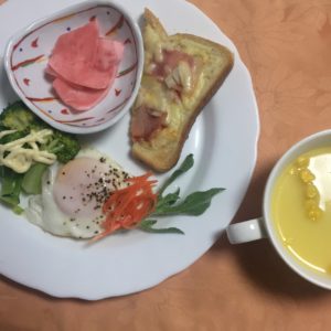 ベーコンチーズトースト、目玉焼きと人参ピクルスにアイスプラント、ブロッコリー、カブの甘酢、コーンポタージュ。