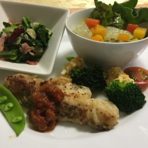 鱈のムニエルとまとソースとエンドウ、タルタルソースがけブロッコリーにプチトマト、ふくだちのペペロンチーノ、人参とグレープフルーツのサラダにアイスプラント。