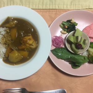 チキンカレー、紫玉葱のピクルスにアイスプラントとブロッコリーの胡麻和え、カブのピクルス、小松菜のナッツ和え。