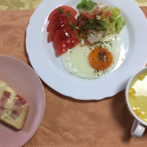 目玉焼き、野菜サラダとトマトスライス、ベーコンチーズトースト、コーンポタージュ。