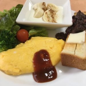西京味噌のミルクポタージュ、スクランブルエッグとトマトにレタス、ヨーグルトと冷凍ピオーネ。
